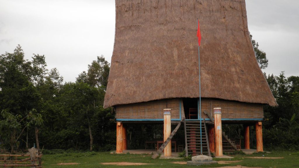 The village houses grouped around the Rong house are typically house-on-stilt with a thatched or tiled roof, and are often decorated with geometric motifs. Bahnar people also erect funeral houses and decorate them with elaborate carvings, though they are not as imposing as those of the Jarai. After the burial, wooden statues, gongs, wine jars and other items of family property will be placed in the funeral house.