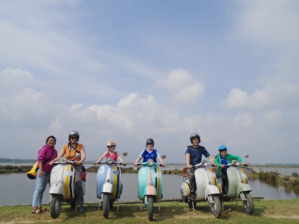 We begin our Vespa Adventure as our experienced drivers bring you out of Hoi An & along the coastal road stopping at the North end of the world renown Da Nang Beach. Then after a quick break on the suspension bridge overlooking Da Nang City & the fishing port, we head along Da Nang Bay where we stop for a local style coffee. Heading up the famous Hai Van Pass by motorbikes, we’ll take in amazing views over the bays before stopping at the top to see the old war battlements and bunkers & learn about the fascinating history and strategic important of the pass. Then it’s down the Hai Van Pass for fun hairpin bends and windy hill roads, before taking a brief stop to take in the amazing view of Lang Co Beach & Lagoon from near the level crossing. It’s back on the Vespas and after riding around a lagoon adorned with stilted houses and oyster farms, we will have a well -deserved lunch in a delightful local setting.